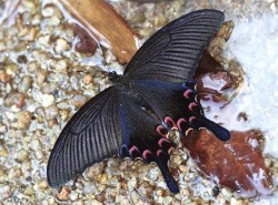飛行緩慢,翅膀以黑色為主,有一對修長的翅尾,於後翅邊緣有紅色的新月形斑紋,襯托著黑色的翅膀,煞是漂亮。 |