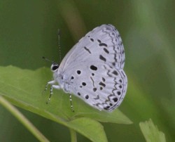 是本港最常見的灰蝶,廣泛分佈在不同的山區及低地。雄蝶的翅面呈金屬藍色,雌蝶的翅面則呈灰白色。前翅翅面有黑色的邊帶,後翅有黑色的圓點和波紋。翅底灰白色,佈滿啡色的斑點和細紋。 |