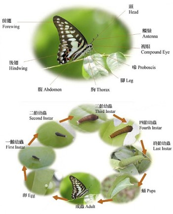成蟲:約經過兩至三星期,蛹會開始裂開,牠們的頭及前足先露出來,並爬出抓著樹枝,讓翅膀伸展及硬化,然後「毛毛蟲」就正式成為美麗的蝴蝶了。(此過程又稱為「羽化」。)